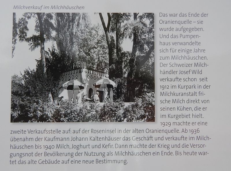 Vor drei Jahren wurde das erste Milchhäuschenfest auf Initiative der ehemaligen Kulturdezernentin Helga Baumann ins Leben gerufen. Das Milchhäuschen war bis 1938 ein wichtiger Ort der hiesigen Milchkur. Ab 1914 wurde die Milchkur in Bad Kreuznach von dem Schweizer Josef Wild betrieben, „direkt von der Kuh“, die Milch wurde vor Ort sterilisiert. Im Oranienquellhäuschen auf der Roseninsel etablierte Wild einen zweiten Standort für den Verkauf von Milch und Milchprodukten, doch als der direkte Abverkauf aus hygienischen Gründen verboten wurde, gab Wild sein Geschäft auf. Später wurde die Milchkur nochmals von Jakob Kaltenhäuser aufgenommen, doch ab 1938 versiegte die Milchkur auf der Roseninsel.