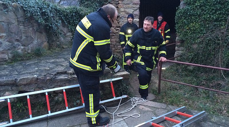 Der angerückte Löschbezirk Süd musste zunächst alle Materialien zur Rettung des Tieres, das sich in etwa zehn Meter Tiefe befand, von den Fahrzeugen etwa 1,5 Kilometer zur Einsatzstelle tragen.