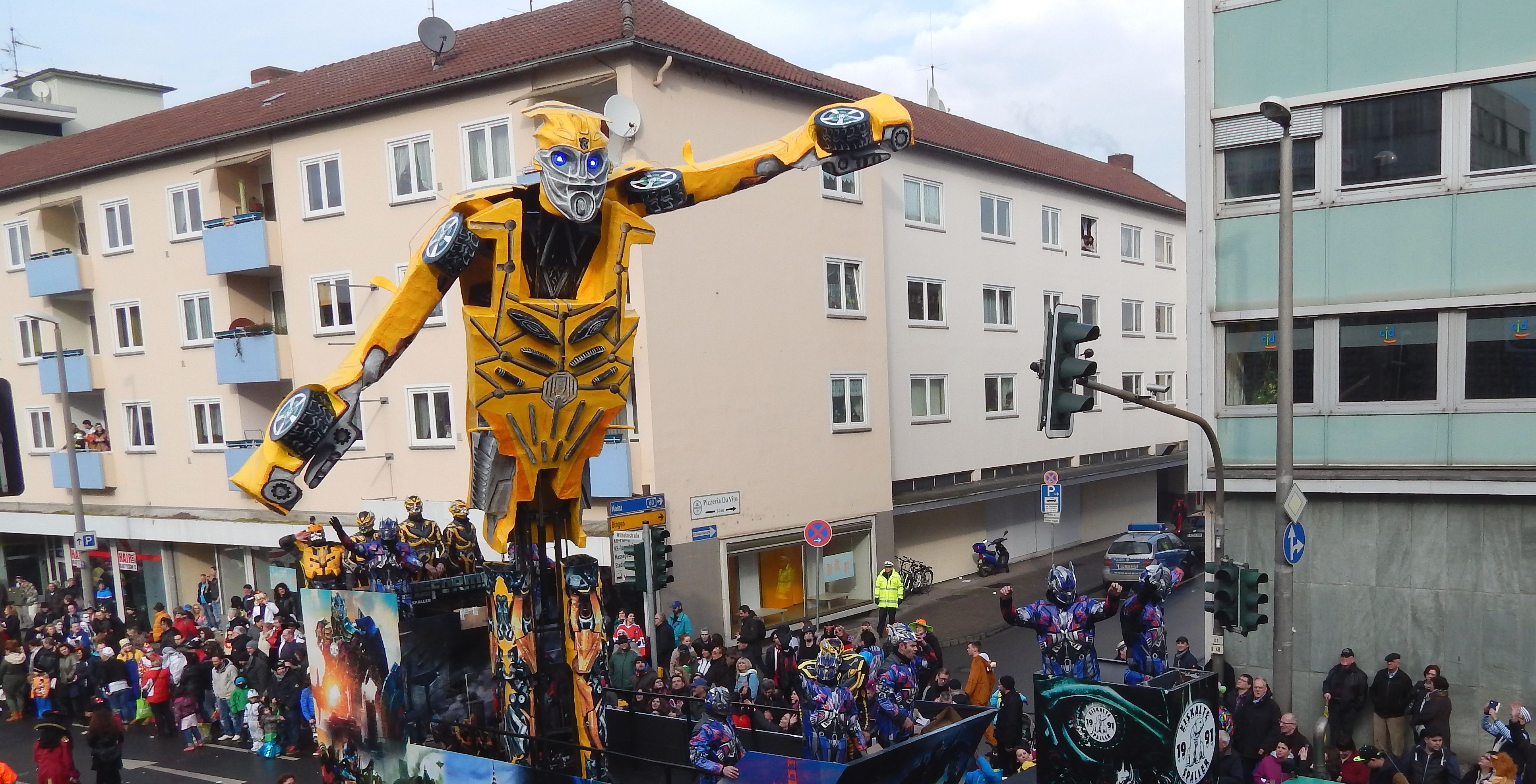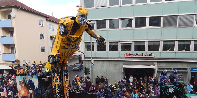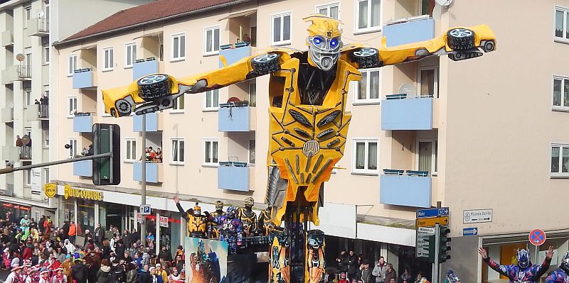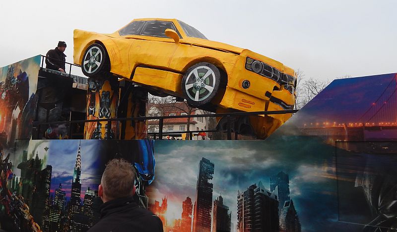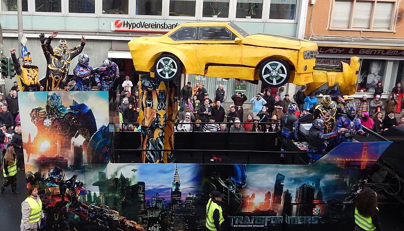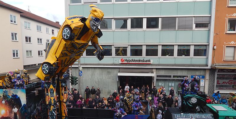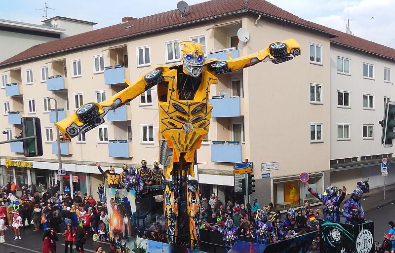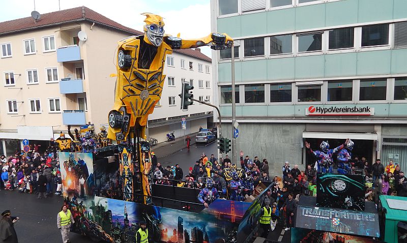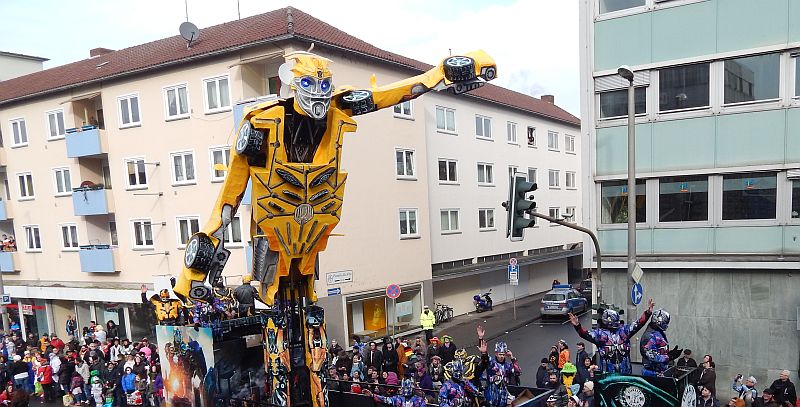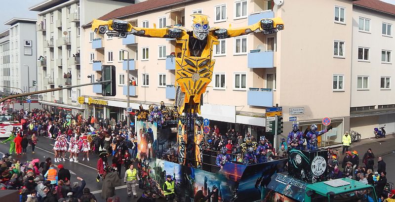 SPALL/MAINZ. (Text/Fotos: Rolf Müller) Einen erneut wahrhaft gigantischen Erfolg konnten die „Eiskalte Spaller“ auch 2015 für sich verbuchen. Nach dem riesigen Eisbären bei der Fassenacht 2013 und „SHRECK“ im vergangenen Jahr, begeisterte die muntere Truppe aus Spall diesmal als „TRANSFORMER“ das närrische Volk auf insgesamt sechs Umzügen, darunter auch in Bad Kreuznach (geschätzte 50.000 Zuschauer) und in Mainz (geschätzte 500.000 Zuschauer).