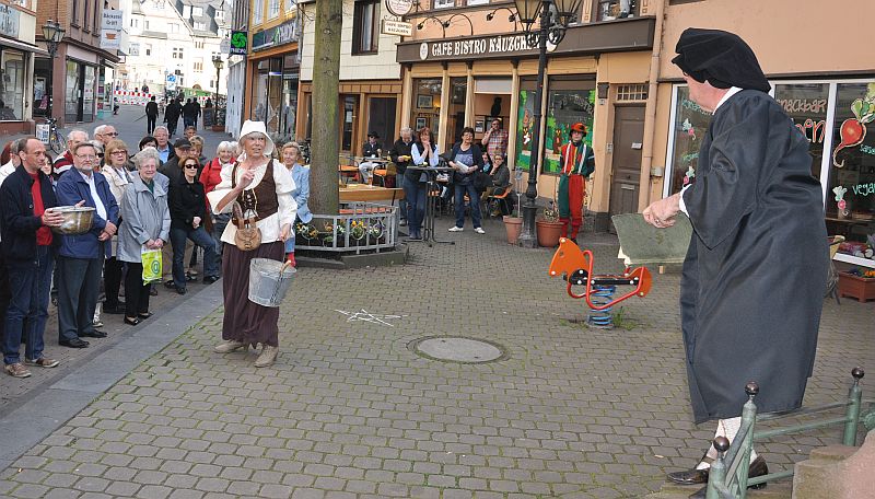 BAD KREUZNACH. Aus Sand werde Gold. Magisches Gebräu in einem Zauberkessel wurde der großen und gespannten Zuschauerschar am Zwingelbrunnen vorgeführt. Drei Mitglieder der VHS-Theatergruppe „art vor ort“ führten im Rahmen der „Geschichtshäppchen“ Szenen aus „Nachbar Faustus“ auf, einem Stück, das der Heimatdichter Clemens Schneider schrieb.