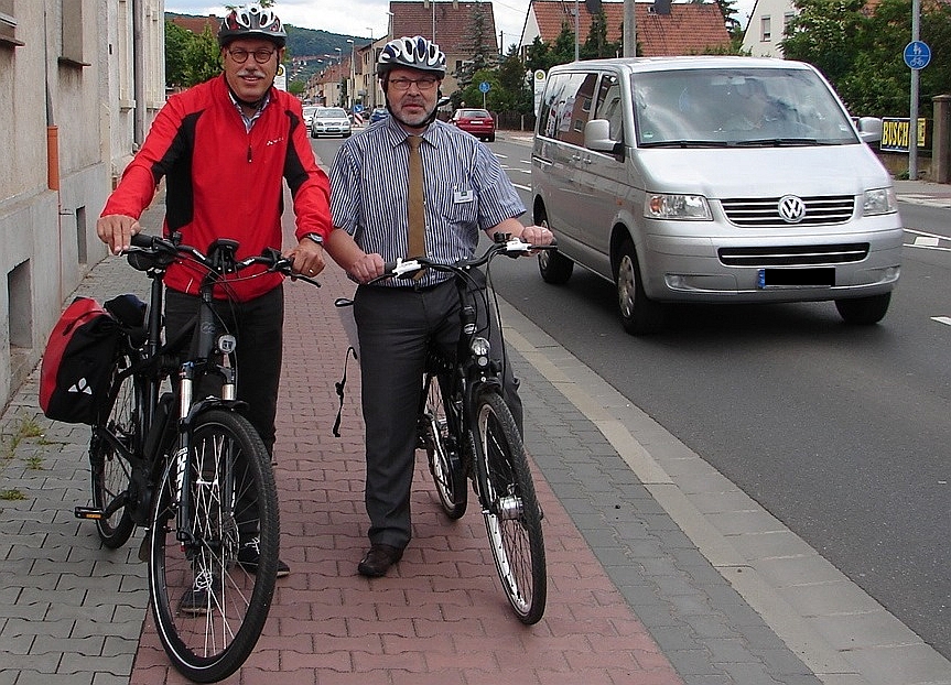 Zu einem Ortstermin hatten sich AOK-Abteilungsleiter Gerald Tenzer und Thomas Fischer, Abteilung Stadtplanung und Umwelt, an der Bosenheimer Straße getroffen, an der ein gut ausgebauter Radweg nach Bosenheim und durch das Industriegebiet nach Planig führt. Für den Ausbau dieses Teilabschnittes hatte sich auch die Rad AG der Stadt stark gemacht.