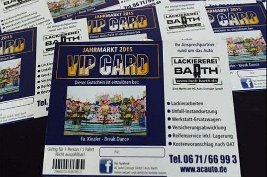 BAD KREUZNACH. Auch in diesem Jahr verschenkt Mathias Barth, von „Lack-Barth“ wieder Bummeltüten für den Kreuznacher Jahrmarkt. Dies macht der 36-jährige nun schon im zehnten Jahr und diesmal sind es insgesamt 4.000 Freikarten. Die Bummeltüte besteht aus V.I.P-Karten, welche für jede Menge Freifahrten auf verschiedenen Fahrgeschäften sorgt.