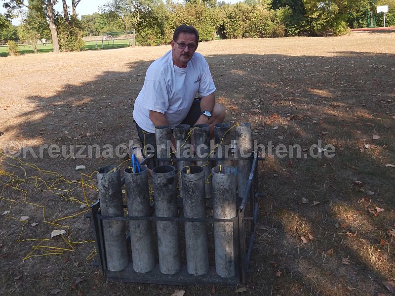 Auf Signal der Freiwilligen Kreuznacher Feuerwehr, schießt der Pyrotechniker aus Müllenbach (Kreis Cochem-Zell) die sieben Kanonenschläge ab. Die steigen etwa 80 bis 100 Meter hoch und explodieren dann mit einem dumpfen Knall. Startschuß für den Jahrmarkt.